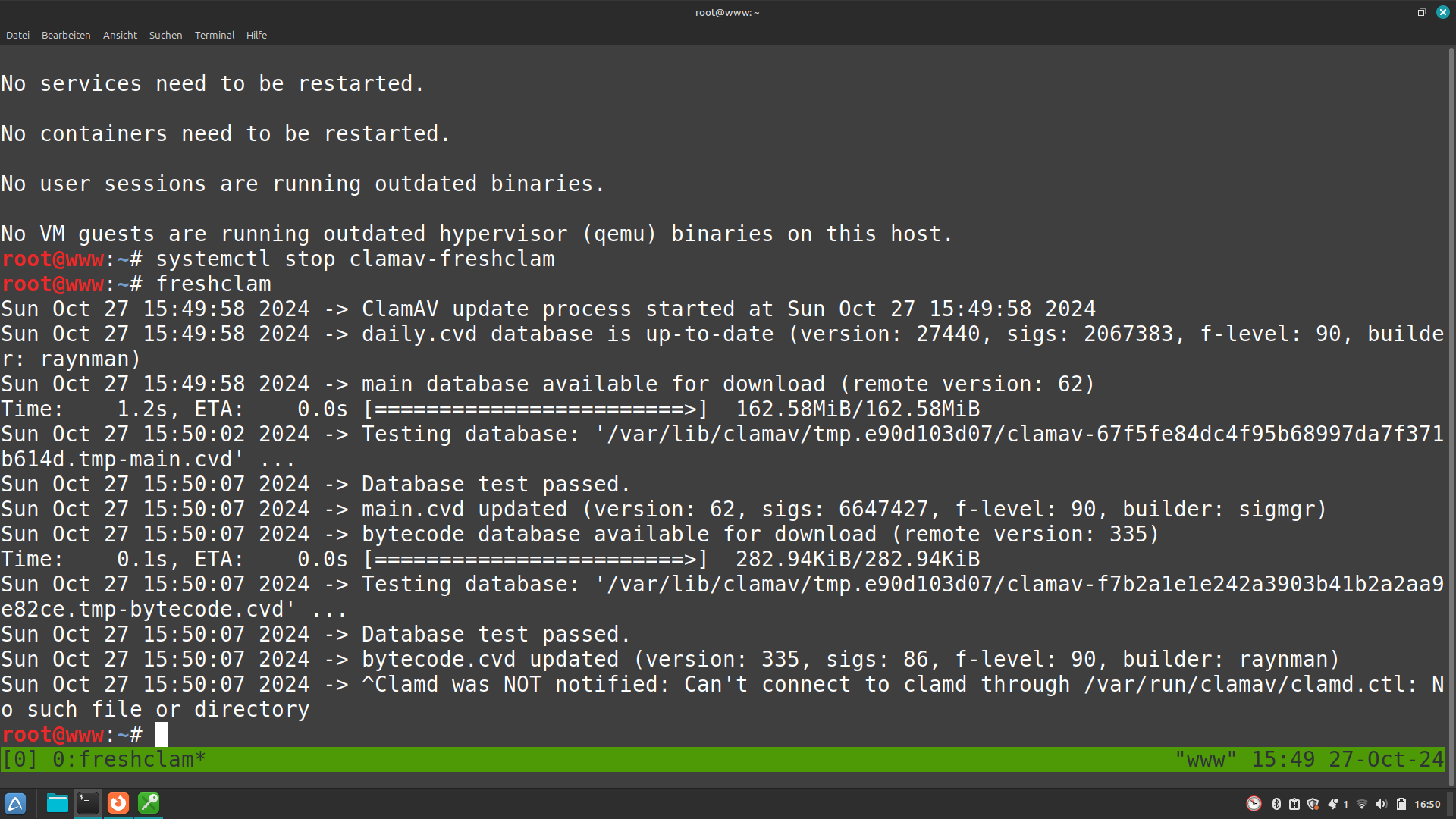 Zuerst muss freshclam Virensignaturen bekommen. Dazu muss zunächst der Freshclam dienst beendet werden